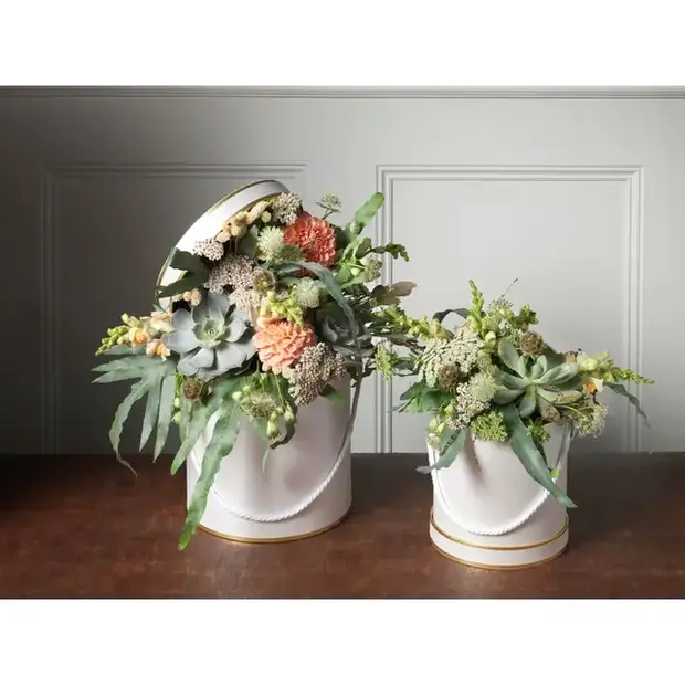 The Floralcraft® Hamilton Hat Boxes in white/gold add elegance to floral arrangements and gift displays. Featuring a beautiful gold trim, matching rope handles, and eco-friendly waterproof liners, these boxes are ideal for showcasing your creations in style.