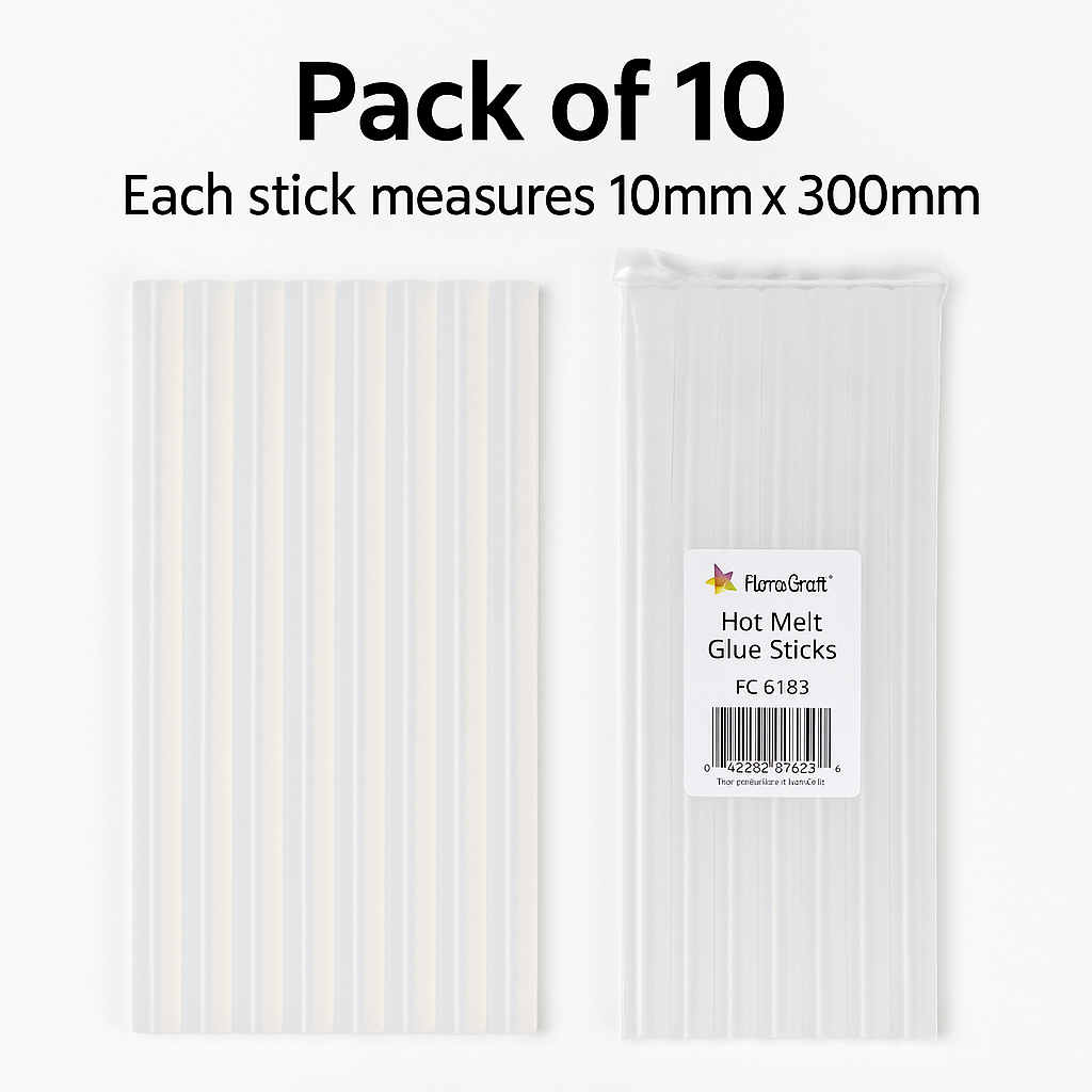 Reliable, trade-grade glue sticks designed for standard 10 mm glue guns. The extra-long 300 mm format means fewer reloads and a clean, strong bond that sets in around 60 seconds—perfect for busy florists, event teams, makers and workshop use.