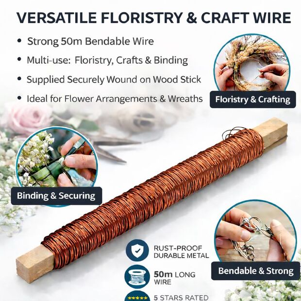 Floralcraft® Metallic Copper Wire on a wooden stick is designed for professional floristry, decorative work, and creative applications where strength and appearance matter.