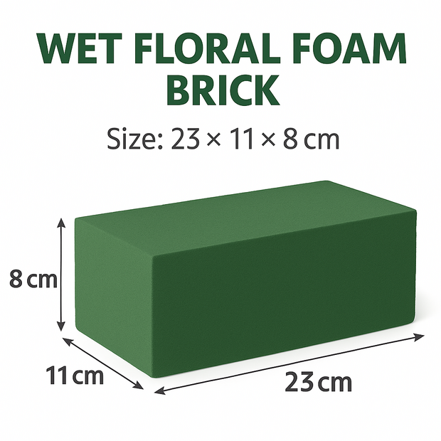Supplied in a trade-friendly carton of 20 standard bricks (approx. 23 × 11 × 8 cm). This professional florist foam absorbs water quickly, holds stems firmly in place, and helps keep flowers fresher for longer. Easy to cut, shape, and fit into bowls, trays or containers — trusted by florists across the UK for weddings, funerals, church flowers and everyday arrangements.