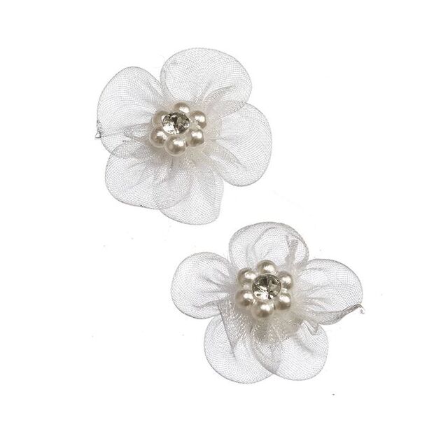 Pack of 12 White organza flowers. Pearls surrounding a 4mm diamante. Self adhesive pad on back for easy application to favour boxes, napkin rings, cards and invitations.Diamante/Pearl FlowersColour: WhiteOrganza FlowerDiameter 2.5cmSix 3mm pearls surrounding a 4mm diamante Unit of sale: 12 flowers