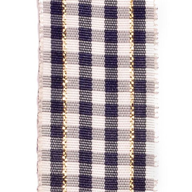 The SHINDO® Gingham Ribbon - Navy is a charming addition to your craft supplies. This subtle, checkered ribbon features a rustic design with a delicate gold thread woven throughout, creating a beautiful contrast. The wired edge ensures that your creations—whether bows, wreaths, or floral arrangements—retain their shape with ease. Perfect for rustic-themed decor, gift wrapping, and DIY projects, this ribbon adds a timeless elegance to any design.