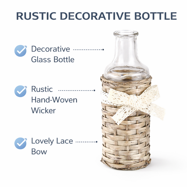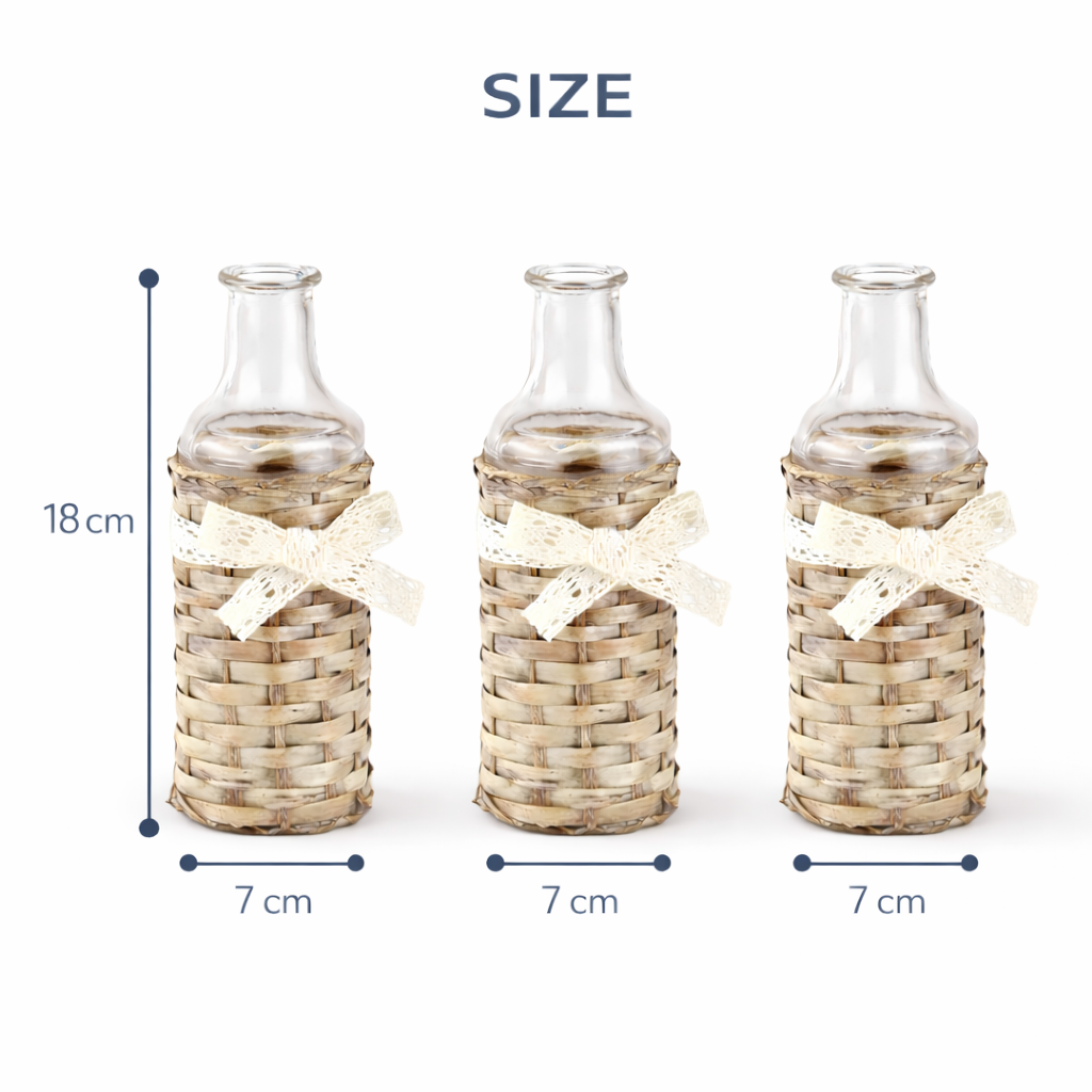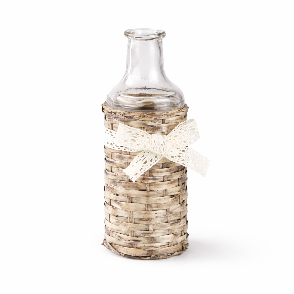 - Material: Clear glass with hand-woven wicker cover