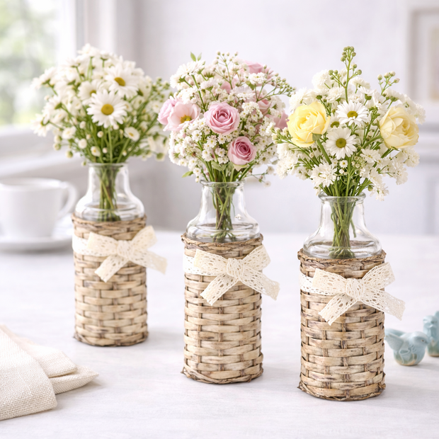 The OASIS® 19cm Glass Bottle in Wicker Cover blends rustic charm with practical floral design. Its clear glass core offers clean lines for arranging, while the hand-woven wicker exterior adds natural texture and countryside character.