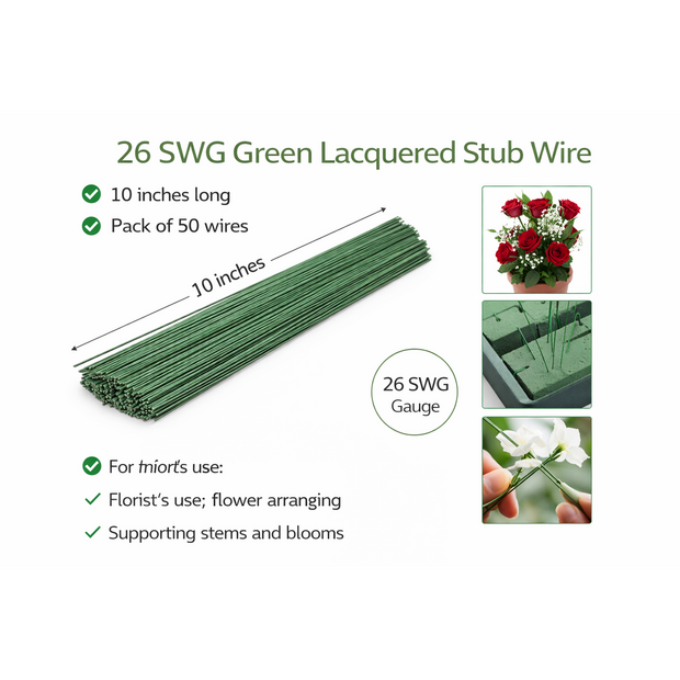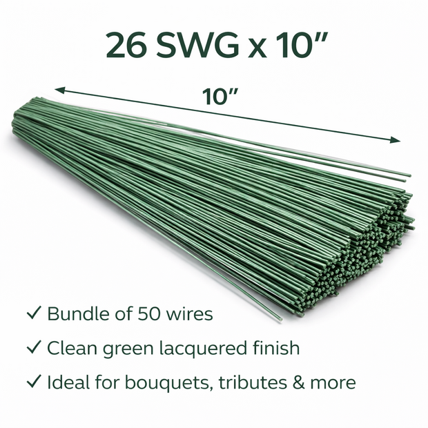 Supplied in a bundle of 50 wires, this 26 SWG x 10" green lacquered stub wire is ideal for wiring flowers, supporting stems and tribute work.
