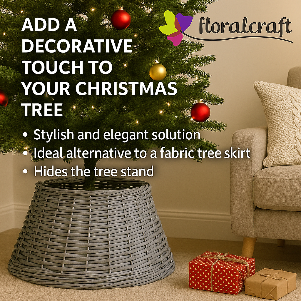 Give your Christmas tree a polished, professional finish with this grey willow Christmas tree skirt. Measuring Ø 57 cm × H 28 cm, this rustic wicker-style tree collar is designed to discreetly hide unsightly stands and pots, while adding a decorative accent to your festive display.