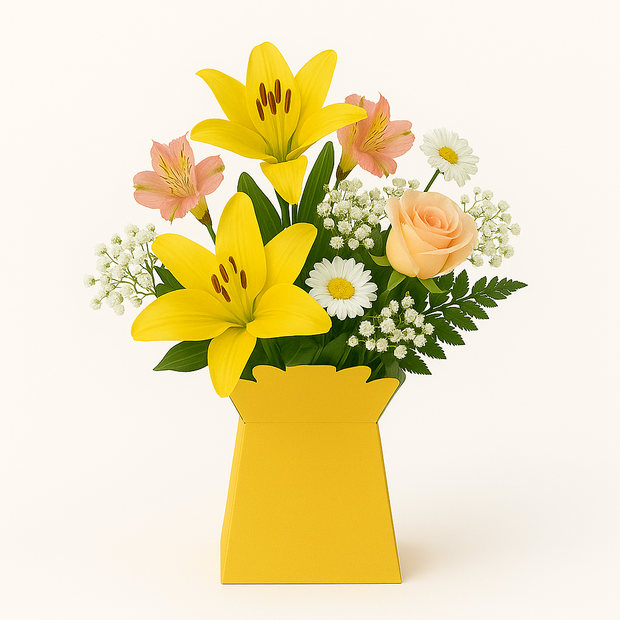 Floralcraft Hand-Tied Vase x30 - Yellow is a professional-grade presentation box for hand-tied bouquets. Supplied flat-packed in a pack of 30, each box features a pearlised glossy finish and sturdy base for aqua-packed arrangements.