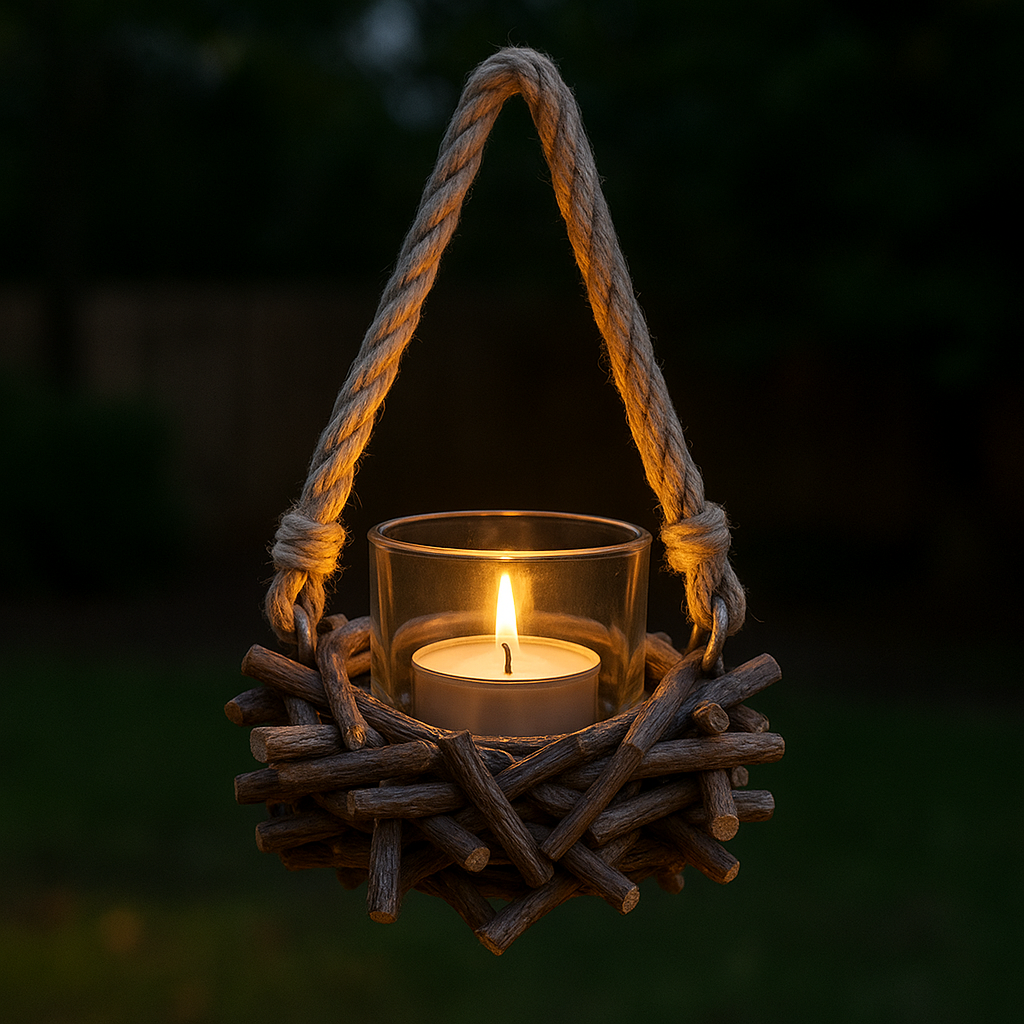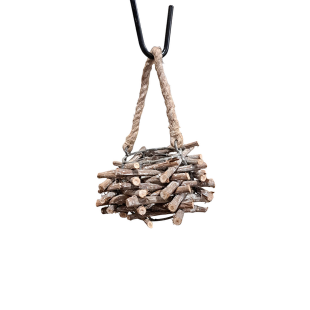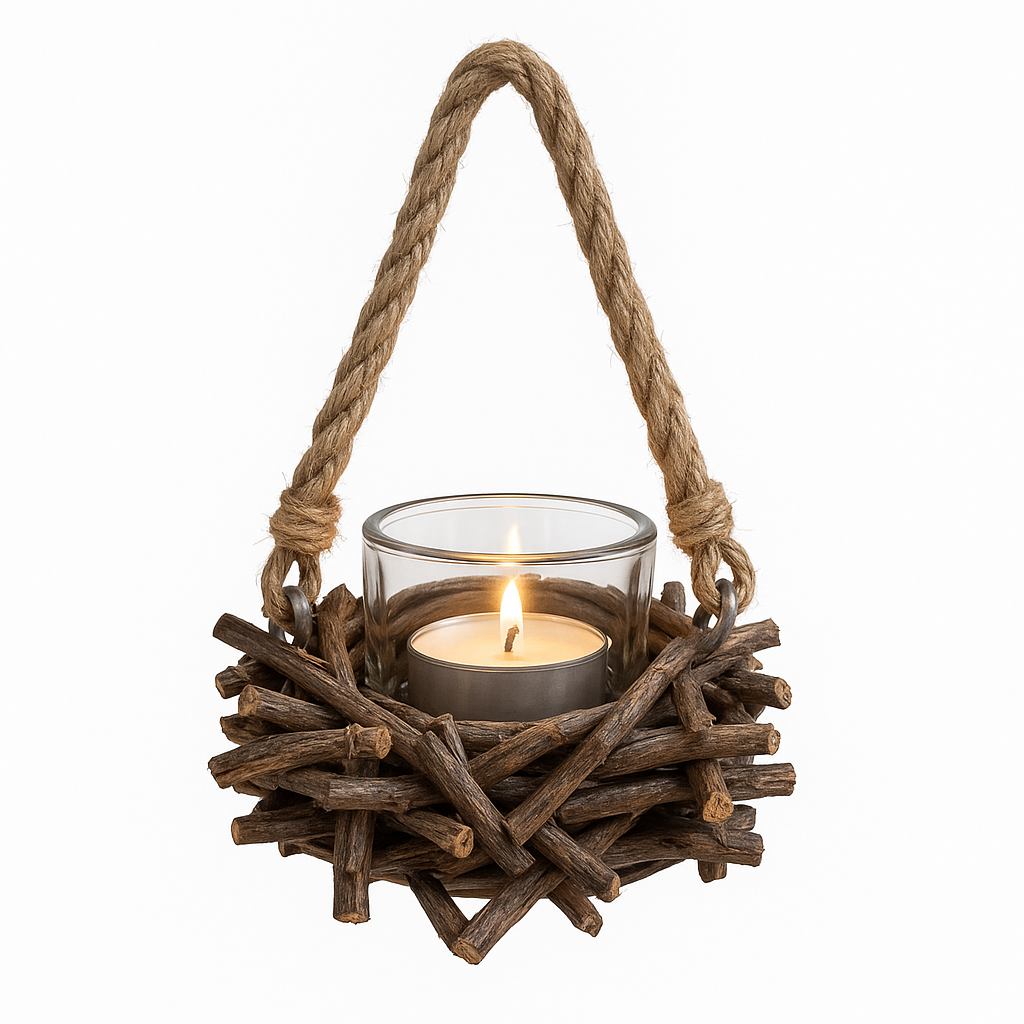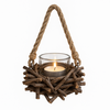 Add a warm, rustic touch to your home or garden with this 15cm Hanging Tealight Holder. Expertly crafted from natural twigs, the frame has an organic, nest-like design that beautifully encloses a glass votive. The thick jute rope handle makes it easy to hang indoors or outdoors, while the soft flicker of a tealight (sold separately) creates a cozy, nature-inspired ambiance.