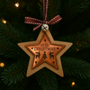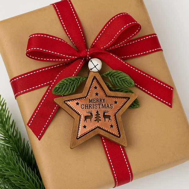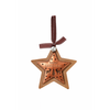 A charming 10cm wooden star Christmas decoration with embossed copper insert, grosgrain ribbon hanger, and two small bells – perfect for rustic festive styling.