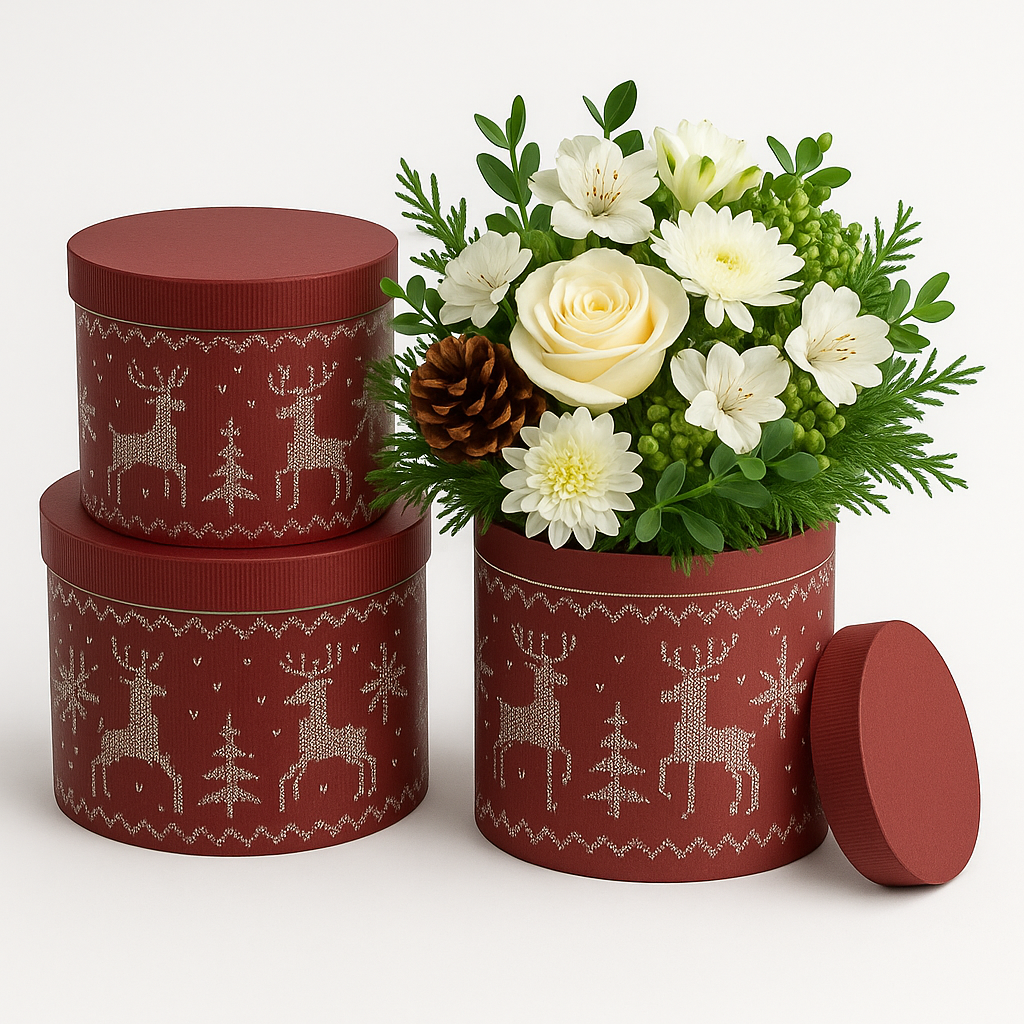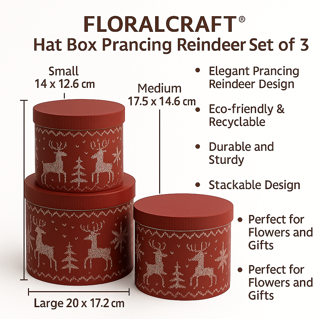 Embrace the spirit of the season with the FLORALCRAFT® Hat Box set featuring charming prancing reindeer designs. The rich burgundy colour adds a touch of elegance, making these boxes perfect for gifting or floral arrangements during the holidays.