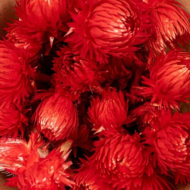 Stylish Design: The Floralcraft® Helychrysum Bunch in Dyed Red offers a chic, modern aesthetic, perfect for contemporary crafting and decor projects.Weight: Comes in a 50g bunch, ideal for multiple creative uses.Versatile Applications: Perfect for creating sophisticated floral arrangements, unique crafts, wedding decor, and stylish home accents.Durable: Naturally dried and expertly preserved to retain its striking color and form over time.Sophisticated Colour: The dyed red tone adds a touch of elegance and sophistication, easily blending with various colour schemes and styles.Eco-friendly: Sustainably sourced and dyed using eco-friendly processes, making it a responsible choice for crafters and decorators.Ready to Use: Ready for immediate use with no extra preparation needed, making your projects hassle-free.