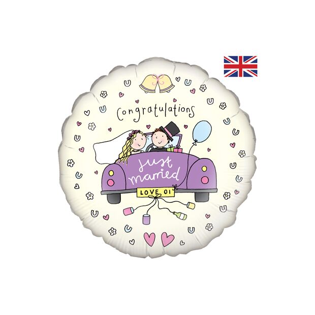 18in heart shaped foil balloon - Just Married. Helium quality foil balloon with self sealing valve. Packaged, barcoded and with eurohook slot. Made in the UK Heart Shaped Foil BalloonSelf sealing valveEurohook slotSize: 18inWith Love on Your Wedding DayUnit of sale: 1 balloon