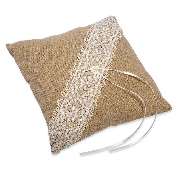 A pretty vintage style square ring cushion in linen, with lace trim. Designed to complement the current trend for natural fabrics such as hessian jute and burlap, the pretty lace trim detail adds that extra special touch and the ribbon ties ensure that rings will not be lost or dropped on their way down the aisle.