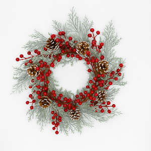 A premium 46cm Winterberry Christmas Wreath featuring snow-tipped greenery, glossy red berries, and eight natural pine cones on a sturdy 25cm vine ring. Perfect for doors, walls, and festive displays.