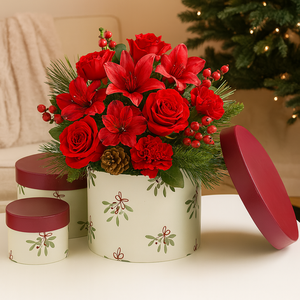 The Noble Cone Hat Box Set of 3 offers sturdy construction and a professional finish, making them ideal for busy florists, retailers, and event planners. Each set contains three nesting sizes for versatile use and easy storage. Their seasonal design ensures they stand out in Christmas and winter displays.