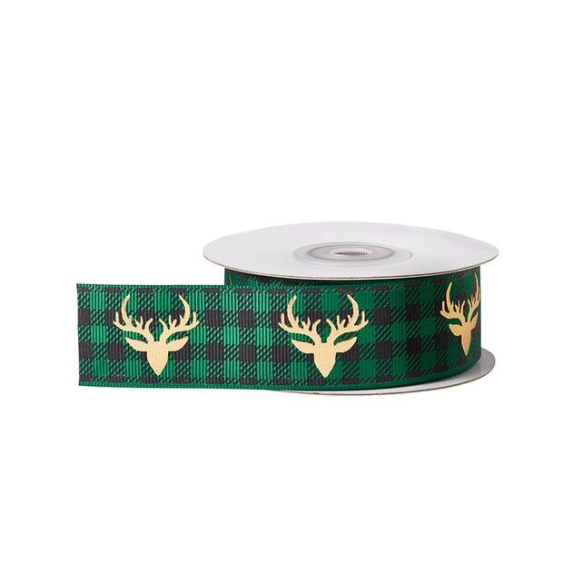 Add a touch of woodland elegance to your holiday decorations with the OASIS® Forest Stags Ribbon. This 28mm wide, 10-meter roll features a striking green and black tartan pattern adorned with a majestic gold stag head design. The ribbon's rich colours and metallic detailing bring a luxurious, nature-inspired element to Christmas crafts, gift wrapping, wreaths, and bows, making it perfect for creating stunning holiday accents that stand out with rustic charm and festive flair.