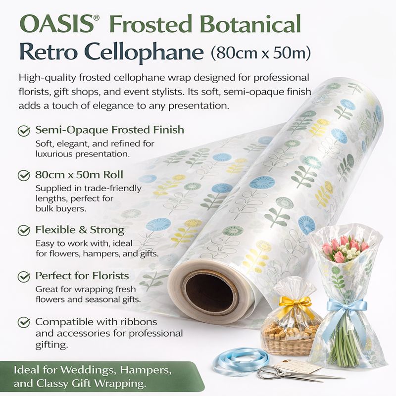 OASIS® Frosted Botanical Retro Cellophane (80cm x 50m) is a high-quality frosted cellophane wrap designed for professional florists, gift shops, and event stylists. Its soft, semi-opaque finish adds a touch of elegance to any presentation.