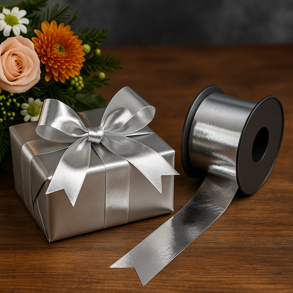 This versatile silver ribbon is a must-have for florists, gift shops, wedding stylists and craft users who want a luxurious finish without the cost of foil ribbon.