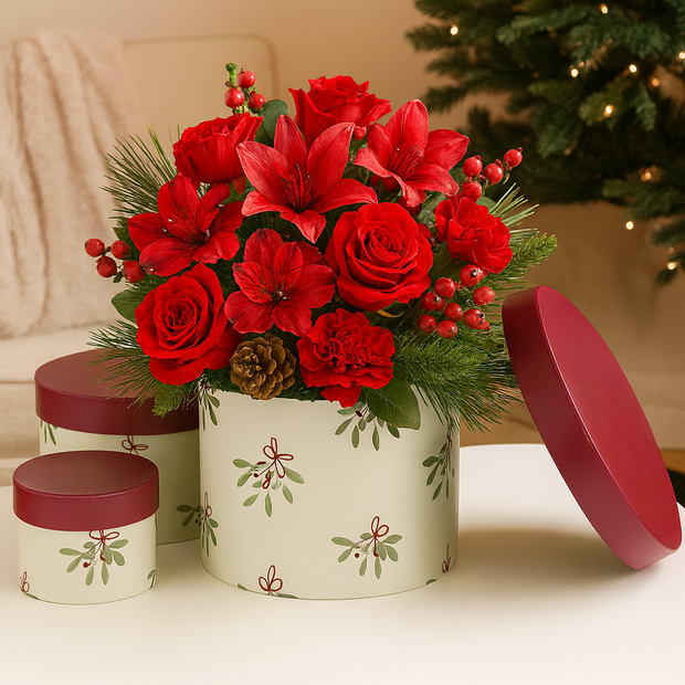 The OASIS® Oh Mistletoe Hat Box Set of 3 blends festive design with practical functionality. Each box features a mistletoe motif paired with contrasting lids, making them ideal for holiday gifting and floral presentation. The nesting sizes save space in storage and add flexibility when assembling gift sets or bouquets.