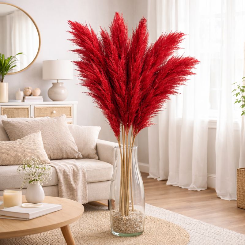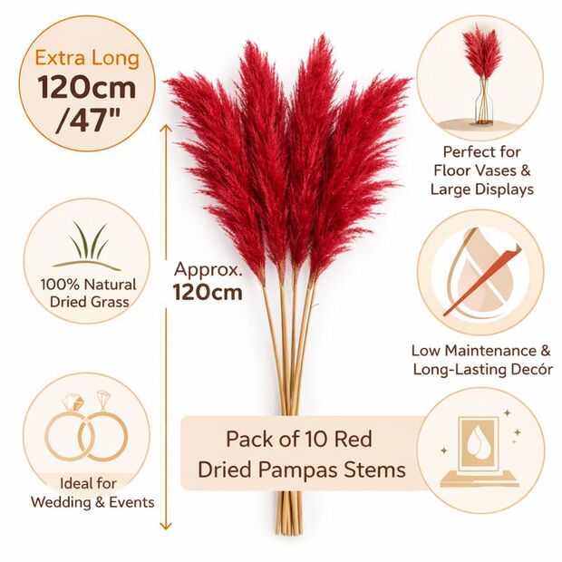 Made from natural pampas grass and finished with a dyed red/burgundy tone, each plume has its own unique character. The long stems make it ideal for tall vases where shorter pampas can look lost.