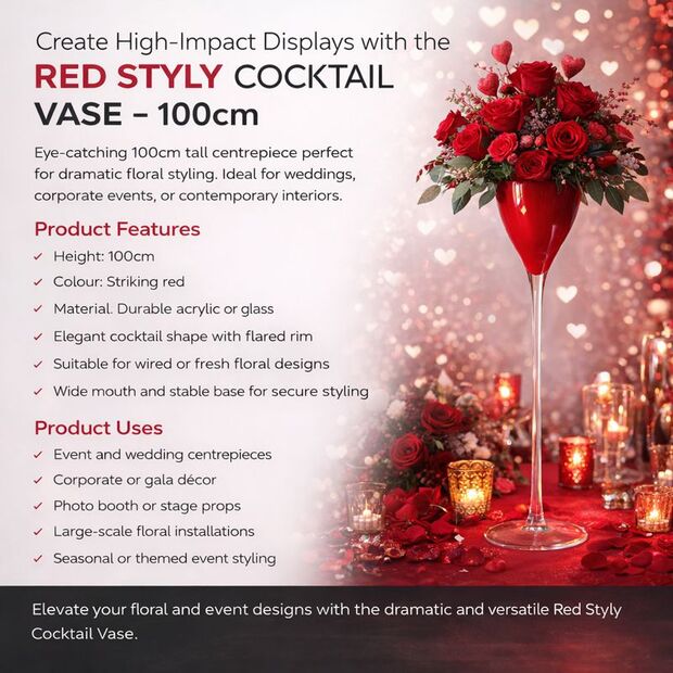 Standing at 100cm high, the red cocktail vase delivers impressive height for long-stemmed flowers, branches, and decorative foliage. The vibrant red finish adds a striking visual impact, ideal for weddings, corporate events, themed parties, and luxury venues.