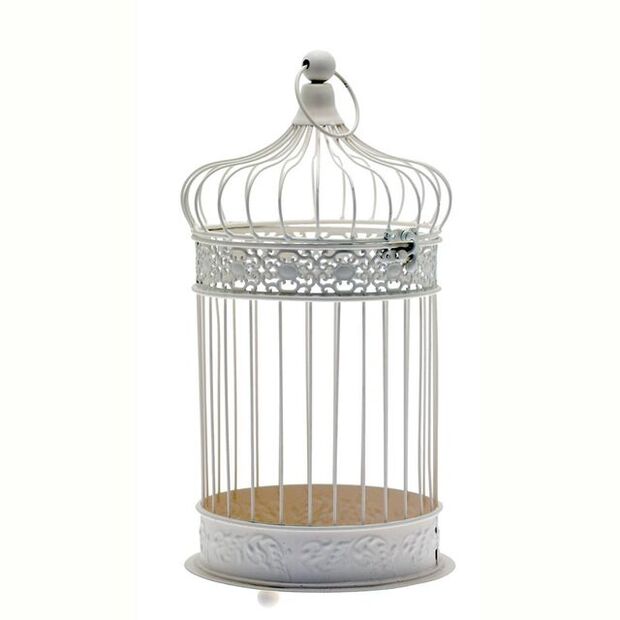 Beautiful 33cm high antique style cream painted decorative round bird cage. Add flowers and fairy lights to create magical table centres, also popular for holding guest cards at wedding receptions. Top removes for easy access to contents. Other styles and sizes available.