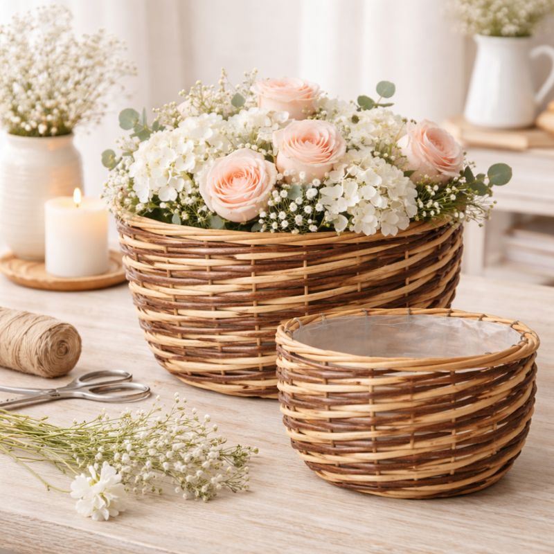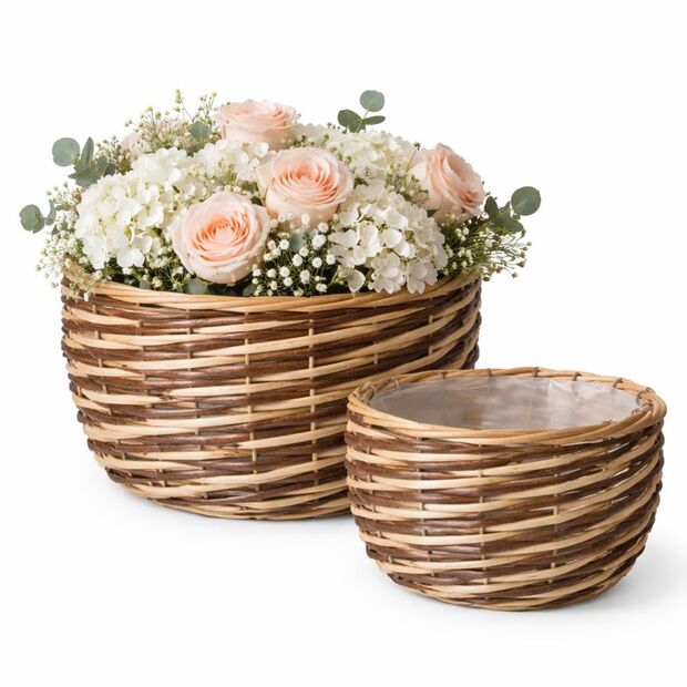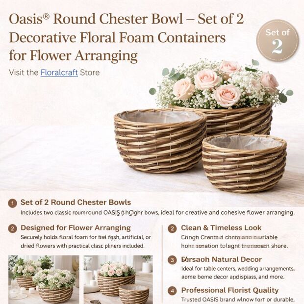 The OASIS® Round Chester Bowl Set of 2 is the perfect blend of style and practicality. These two-tone willow weave baskets feature waterproof liners, making them ideal for both floral arrangements and planted displays. With their classic round bowl shape, they add a rustic yet elegant touch to any setting. Whether used for creating stunning floral designs with OASIS® Floral Foam or for planting small shrubs or flowers, these versatile bowls are perfect for indoor and outdoor decor. Sold as a set of two, the OASIS® Round Chester Bowls are part of the limited edition seasonal collection, offering timeless beauty and durability.