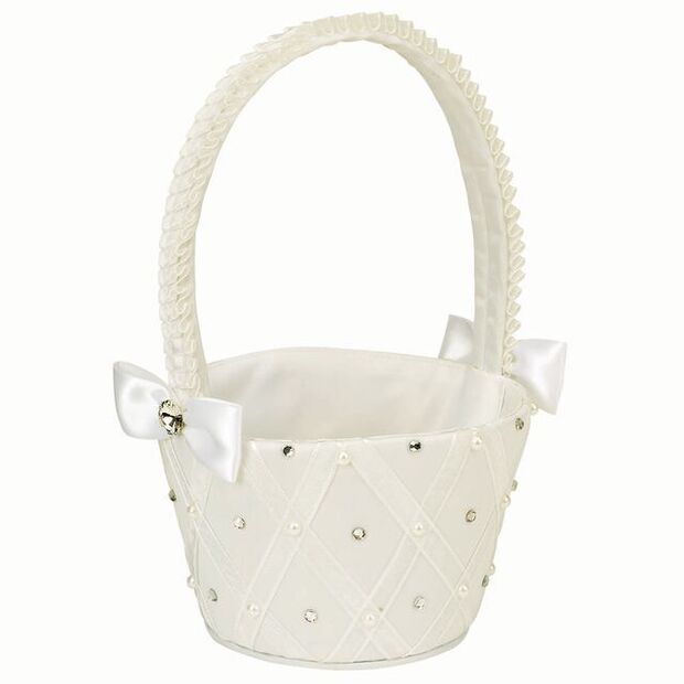 This pretty Round Ivory Satin Bridesmaid Basket is ideal for both bridesmaids and flower girls, or as a stylish container for rose petals or confetti. Beautifully satin-covered and cotton-lined, it features delicate diamante and pearl beads over a criss-cross organza ribbon detail for a truly elegant touch.