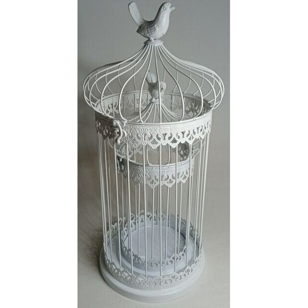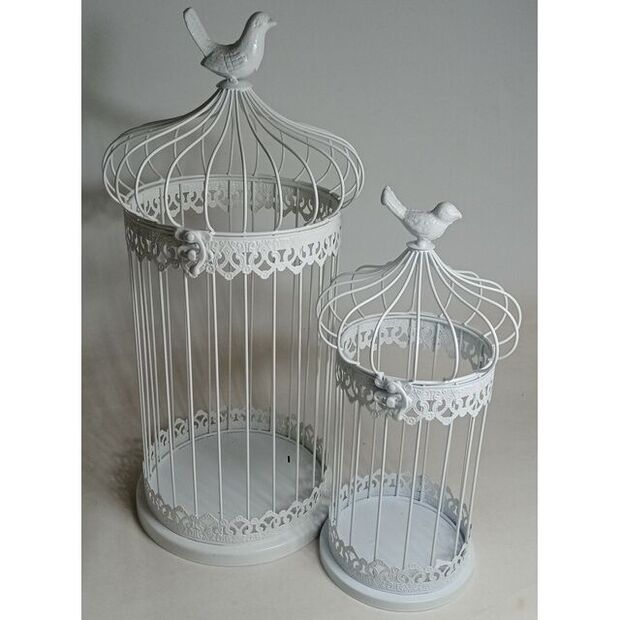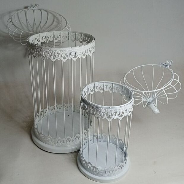 Set of 2 ornate round metal bird cages. An eye-catching and attractive way to collect cards and monetary gifts at the wedding reception and make a great bridal shower present. They can be dressed up with ribbons, petals and white feather doves. Lids lift off for easy retrieval of contents. Set of 2 Round Metal Bird CagesLarge Cage: Height: 44cmOuter Base diameter: 20cmCage diameter: 17.5cmSmall Cage: Height: 34cmOuter Base diameter: 20cmCage diameter: 12cmUnit of sale: 1 set of 2 cages