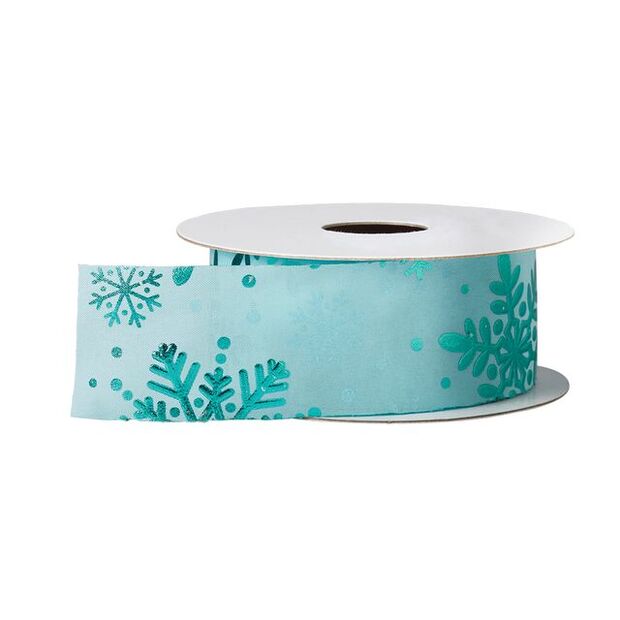 OASIS® Snowflake Ribbon - Blue is the perfect festive ribbon for all your holiday decorations. Featuring a beautiful light blue base with metallic turquoise snowflakes in various sizes, this ribbon adds a touch of winter wonderland charm to your floral arrangements, gift wrapping, or seasonal crafts. Ideal for creating stunning seasonal displays, wreaths, or any other festive décor, this ribbon brings the magic of snowflakes to life.