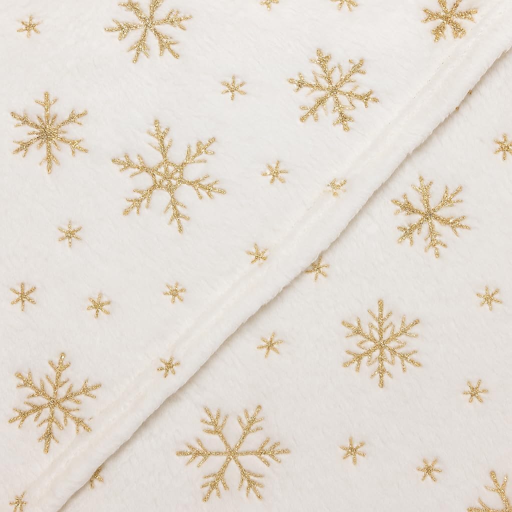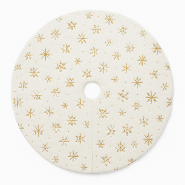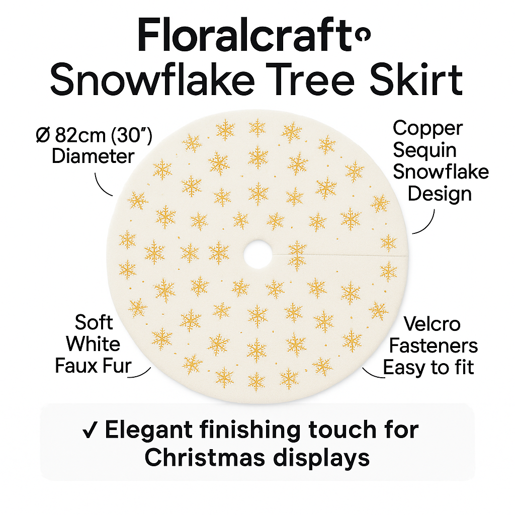 Bring a crisp, wintery elegance to your tree base with the Floralcraft® Snowflake Tree Skirt. Measuring Ø 82 cm, this white faux-fur Christmas tree skirt offers substantial coverage while adding a luxe, festive finish. Hand-crafted snowflake motifs, stitched with copper sequins, add sparkle and charm without overpowering your decorations.