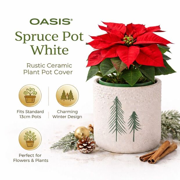 Add subtle seasonal charm to your displays with the OASIS® Spruce Pot in White, a decorative ceramic plant pot cover designed to elevate both plants and floral arrangements. Featuring a soft white finish with a delicate textured surface and spruce tree motif, this pot brings a calm, winter-inspired look to any setting.