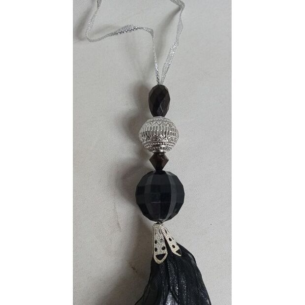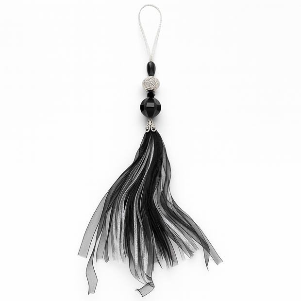 Add a touch of elegance and versatility to your décor with the Floralcraft® Tassel in Black/Silver. Measuring 24cm in length, this striking tassel features a mix of flowing black and silver strands, accented by coordinating black and silver gems for a refined, sparkling finish.
