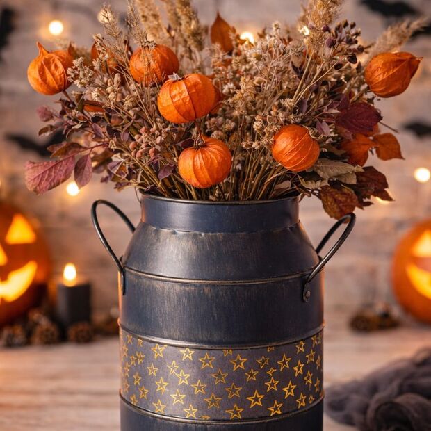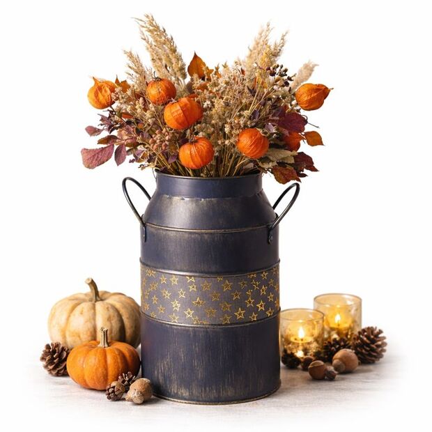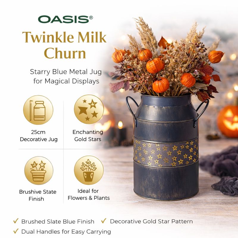 The OASIS® Twinkle Milk Churn is a striking decorative container designed to add character and charm to floral and home décor displays. Finished in a rich brushed slate blue with a whimsical gold star band, this milk churn offers a unique blend of rustic styling and festive detail.