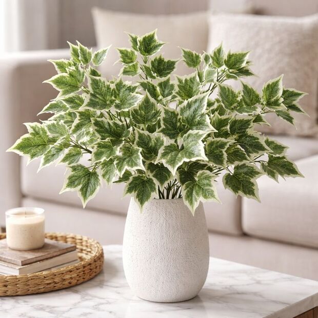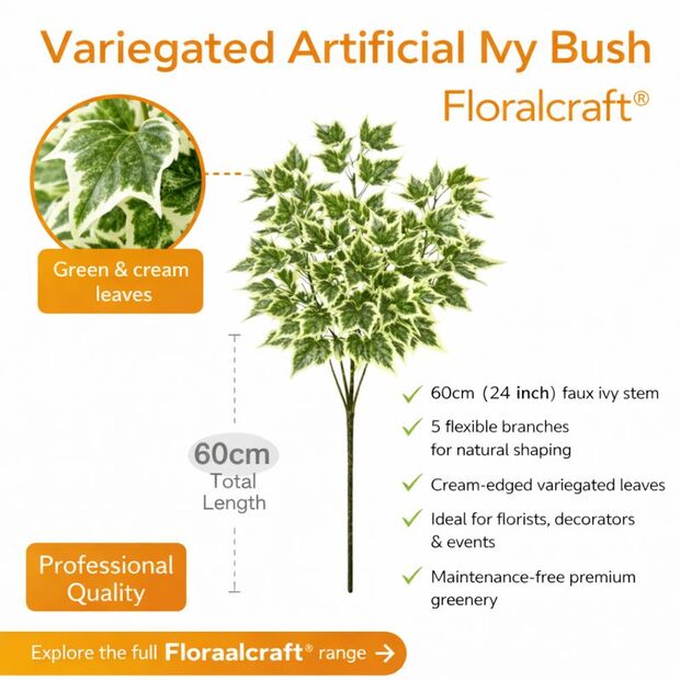 With five flexible branches and realistic cream-edged ivy leaves, it creates a fuller, brighter greenery look in vases, arrangements, garlands and permanent displays. The 60cm stem can be trimmed with wire cutters to suit smaller containers or bespoke designs.
