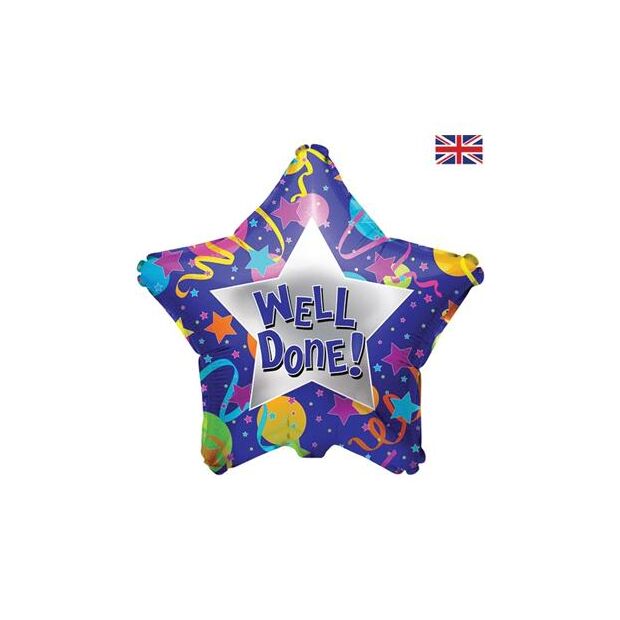 19in Celebration Star Shaped Foil Balloon. Message - Well Done. Made in the UK