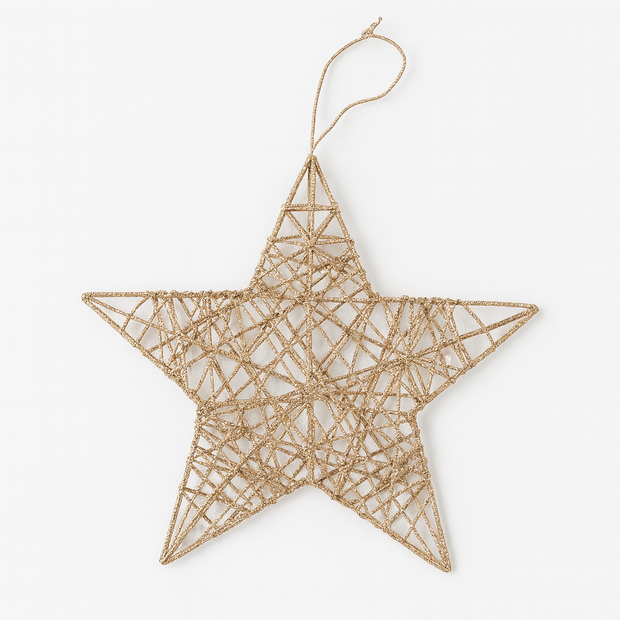 A 20 cm Champagne Gold 3D Glittered Wire Star with matching gold thread. Elegant, sparkling, and visible from every direction — ideal for Christmas trees, window displays & festive décor.