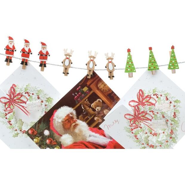 Display your holiday cards in a fun and festive way with this set of 12 Xmas Peg Card Holders. Featuring charming designs of Santas, Reindeers, and Trees, these wooden pegs add a playful touch to your holiday decor.